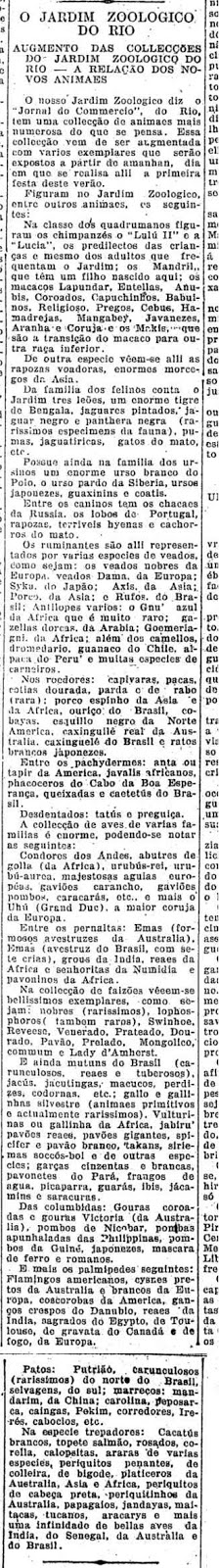 | DESCRIÇÃO | “O Estado de S.Paulo” reproduz relação informada pelo “Jornal do Commercio” com animais sob a posse do Jardim Zoológico do Rio de Janeiro, incluindo chimpanzés Lulú II e Lucia, que seriam “os predilectos das crianças e mesmo dos adultos que frequentam o Jardim”. |