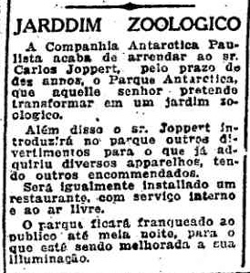 DESCRIÇÃOEmpresário Carlos Joppert aluga por 10 anos área no Parque Antártica para a construção de um zoológico na cidade de São Paulo. Não foram encontradas outras referências sobre a empreitada, o que leva a crer que ela não foi bem-sucedida.