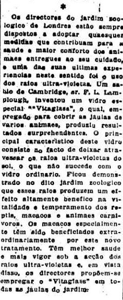 Cientista de Cambridge cria vidro – batizado de Vitaglass- para cobrir jaulas de animais no zoológico de Londres. Segundo o fabricante, o vidro permitiria que os raios ultravioletas do Sol chegassem aos macacos e animais carnívoros do plantel, para melhoras na saúde e no humor. A experiência foi utilizada para promover a venda do mesmo vidro, mas para humanos.