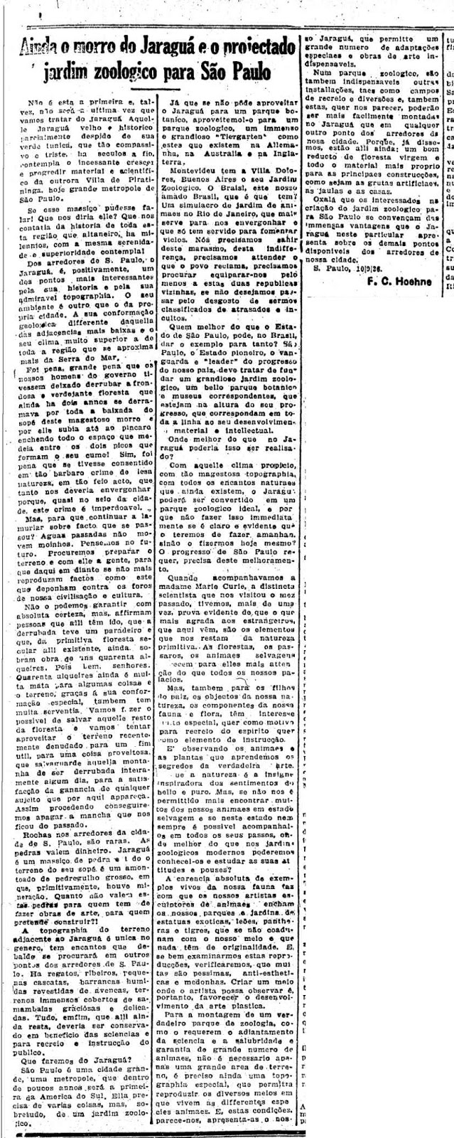 Artigo assinado pelo botânico Frederico Carlos Hoehne defende a construção de um zoo municipal no Jaraguá. Segundo ele, o zoológico também seria necessário para que São Paulo não ficasse com a pecha de atrasada: