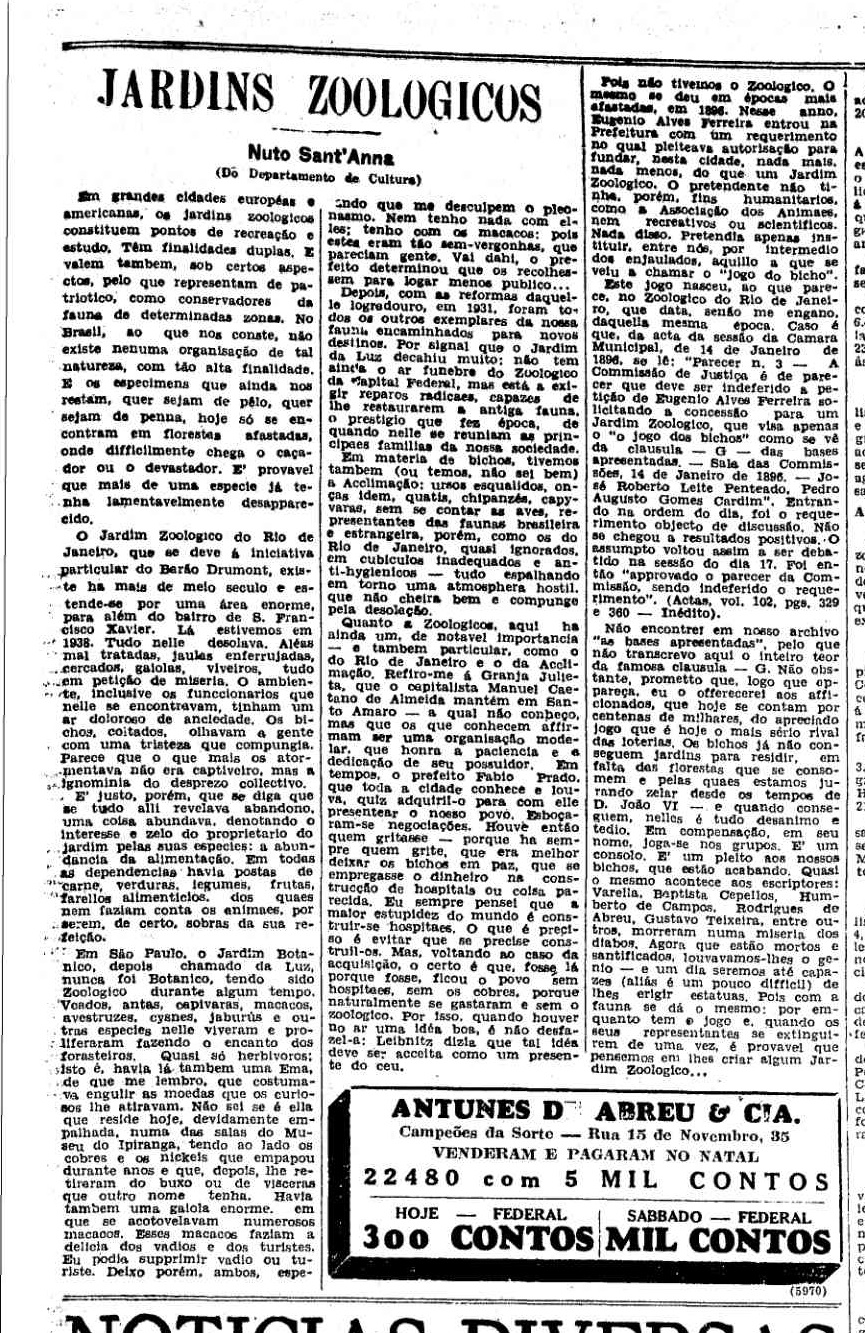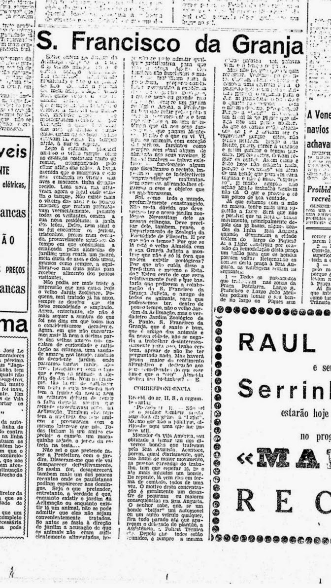 A sociedade “Amigos da Cidade”, sob presidência de Ubaldo Franco Carby, opina sobre a sugestão feita por Walfrido Prado Guimarães de que o jardim zoológico de propriedade particular na Granja Julieta deveria ser adquirido pelo Estado ou pela Prefeitura de São Paulo. No mesmo texto, é chamada a atenção para a brutalidade em que os animais de tração vinham sendo tratados na cidade. “Essa comissão, considerando que São Paulo, como grande centro, necessita realmente de uma exposição zoológica com fins instrutivos e de diversão [grifo meu], é de parecer que se indique ao interventor federal a oportunidade da aquisição da referida granja, antes que se disperse a coleção de pássaros e animais ali reunidos. (…) Por um dos membros do conselhos diretor foi finalmente acentuada a deshumanidade que se verifica no tratamento dispensados aos animais de tração em São Paulo, na atual fase de dificuldades de transporte. Carroções superlotados de carga exigem esforço brutal dos animais, que são conduzidos frequentemente à força de chicote” |
