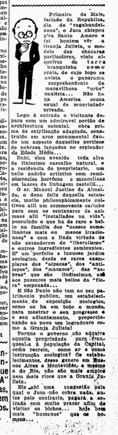 A sociedade “Amigos da Cidade”, sob presidência de Ubaldo Franco Carby, opina sobre a sugestão feita por Walfrido Prado Guimarães de que o jardim zoológico de propriedade particular na Granja Julieta deveria ser adquirido pelo Estado ou pela Prefeitura de São Paulo. No mesmo texto, é chamada a atenção para a brutalidade em que os animais de tração vinham sendo tratados na cidade. “Essa comissão, considerando que São Paulo, como grande centro, necessita realmente de uma exposição zoológica com fins instrutivos e de diversão [grifo meu], é de parecer que se indique ao interventor federal a oportunidade da aquisição da referida granja, antes que se disperse a coleção de pássaros e animais ali reunidos. (…) Por um dos membros do conselhos diretor foi finalmente acentuada a deshumanidade que se verifica no tratamento dispensados aos animais de tração em São Paulo, na atual fase de dificuldades de transporte. Carroções superlotados de carga exigem esforço brutal dos animais, que são conduzidos frequentemente à força de chicote” |