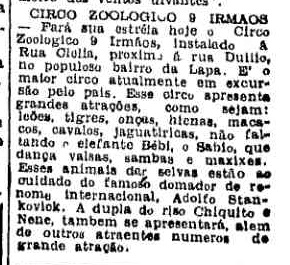 Circo Zoológico 9 Irmãos chega a cidade de São Paulo. Traz animais como leões, tigres, onças, hienas, macacos, elefante (chamado Bébi, o Sábio), entre outros. O domador responsável é Adolfo Stankovick.